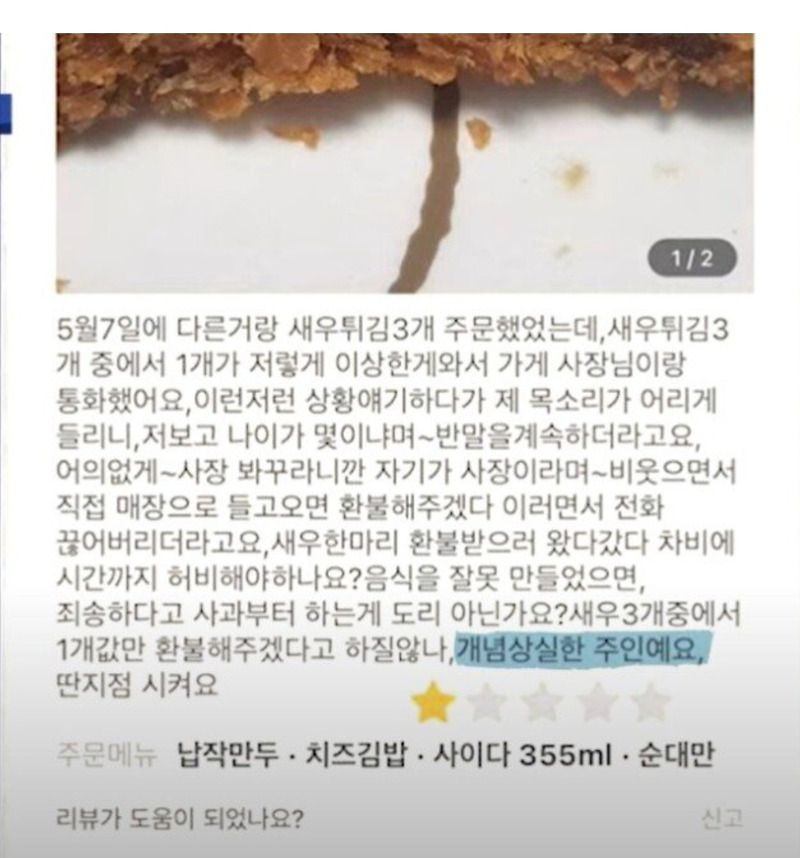 환불을 요청한 이의 본래 의도가 정말 새우튀김에 대한 불만이었는지는 모르겠으나 전날 주문해 다 쳐먹은걸 좆도 아닌 미개한 씹새끼가 꼴에 갑의 위치에.